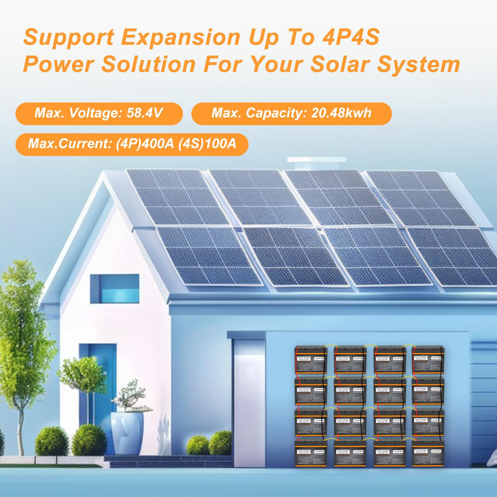 Our battery Support Capacity and Voltage Expansion-in parallel and in series.For Example:(4 Pack) 12V 100Ah lifepo4 battery connection Tips